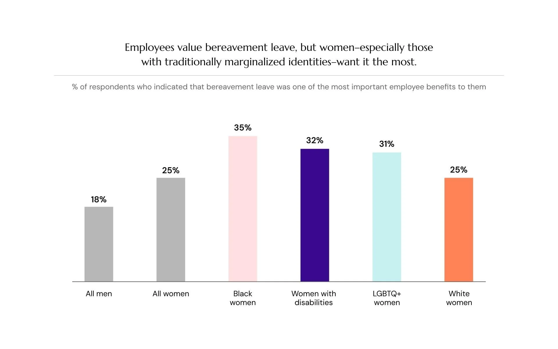 → Lean In, A surprising employee benefit that often tops the list for women with marginalized identities: Bereavement Leave, 2023Companies that offer expanded bereavement leave report higher employee morale, productivity, and retention.